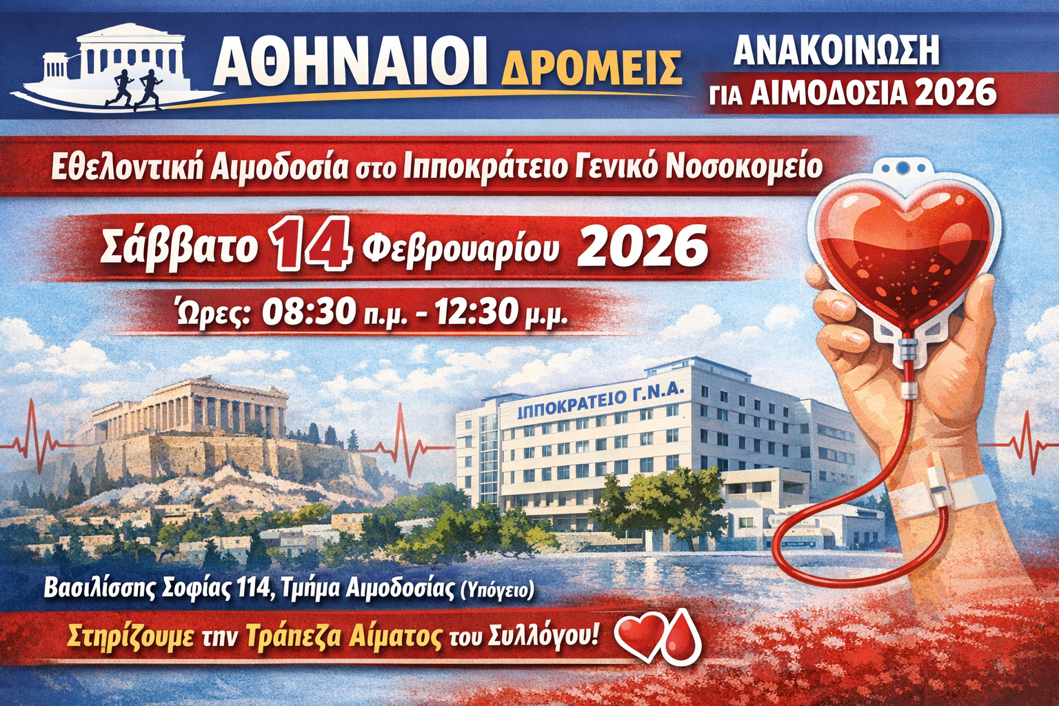 Ο Αθλητικός Πολιτιστικός Σύλλογος «Αθηναίοι Δρομείς» στα πλαίσια της κοινωνικής ευαισθησίας και προσφοράς προς τον συνάνθρωπο, διοργανώνει, όπως κάθε χρόνο, αιμοδοσία που θα πραγματοποιηθεί στο «Ιπποκράτειο» Γενικό Νοσοκομείο, Βασιλίσσης Σοφίας 114, στο τμήμα αιμοδοσίας (υπόγειο), το Σάββατο 14 Φεβρουαρίου 2026 και ώρες 08:30 π.μ. – 12:30 μ.μ., ενισχύοντας παράλληλα και την Τράπεζα Αίματος του Συλλόγου.