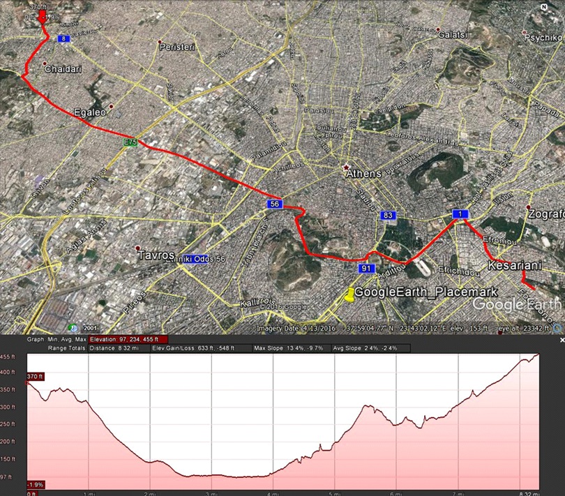 3. Διαδρομή: Η διαδρομή του αγώνα καλύπτει την απόσταση 14.1 χλμ. με αφετηρία το Μπλοκ 15 εντός του Στρατοπέδου Χαϊδαρίου και τερματισμό εντός του Σκοπευτηρίου Καισαριανής. Η κίνηση των δρομέων θα γίνεται αυστηρά στην δεξιά πλευρά του δρόμου καθ’ όλη την διάρκεια της διαδρομής προς αποφυγή ατυχημάτων.